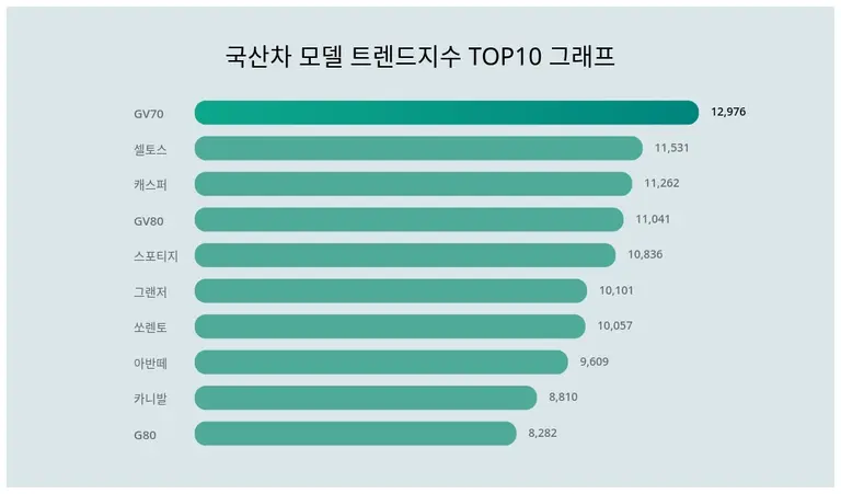 트렌드지수 1위는 GV70이 12,976포인트를 기록하며 가장 많은 관심을 갖는 것으로 나타났으며, 2위 셀토스, 3위 캐스퍼, 4위 GV80, 5위 스포티지 순으로 나타났다.