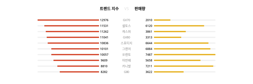 추가적으로 트렌드지수 3위 캐스퍼는 3,861대, 4위 GV80은 3,313대, 5위 스포티지는 6,644대, 6위 그랜저는 6,884대, 7위 쏘렌토는 7,487대, 8위 아반떼는 5,658대, 9위 카니발은 7,211대, 10위 G80은 3,622대를 기록했다.