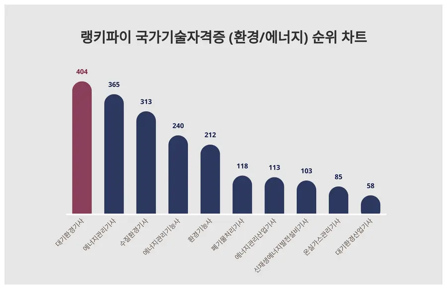 랭키파이 분석 결과 국가기술자격증 (환경/에너지) 트렌드지수 순위 1위는 404포인트를 받은 대기환경기사, 2위는 365포인트인 에너지관리기사, 3위는 313포인트의 수질환경기사(이)다.