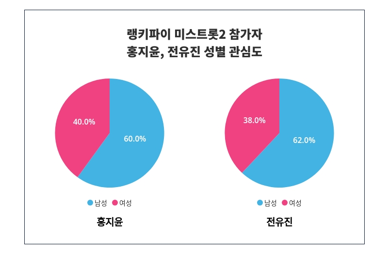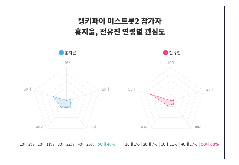 연령별 관심도 조사에서 홍지윤과 전유진의 관심도가 다양한 연령층 사이에서 어떻게 분포되어 있는지 명확히 드러났다. 조사 결과, 홍지윤은 특히 50대에서 40%의 높은 관심도를 기록하며 가장 큰 관심을 끌고 있는 것으로 나타났다. 홍지윤의 인기는 10대 2%, 20대 11%, 30대 22%, 40대 25%, 50대 40%순으로 이어지며, 각 연령대별에서 어떠한 관심을 받고 있는지가 조사되었다.