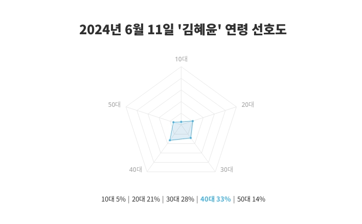 연령별 선호도 조사에서 40대의 관심도가 33%로 나타나, 특히 40대에게서 높은 인기를 확인할 수 있었다. 이는 전일 10대 6%, 20대 21%, 30대 27%, 40대 32%, 50대 13%와 비교하여 연령별 관심의 변화를 설명해 준다.