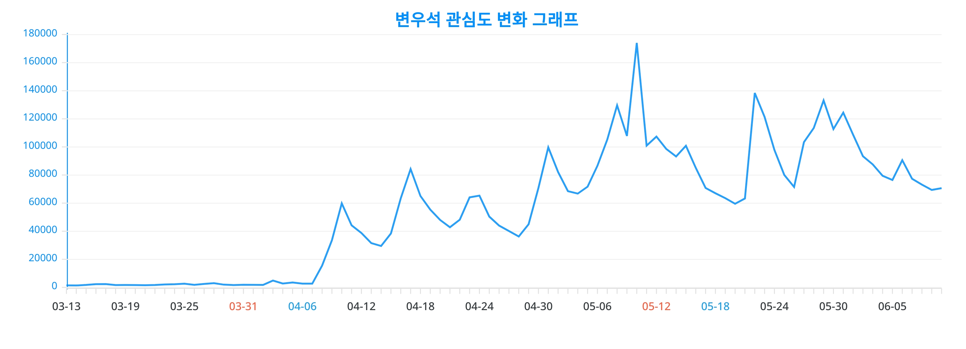 변우석에 관한 트렌드지수 그래프가 최근 업데이트 되었으며, 현재 70,687 포인트를 기록, 전일 69,445 포인트 대비 상승하였다.