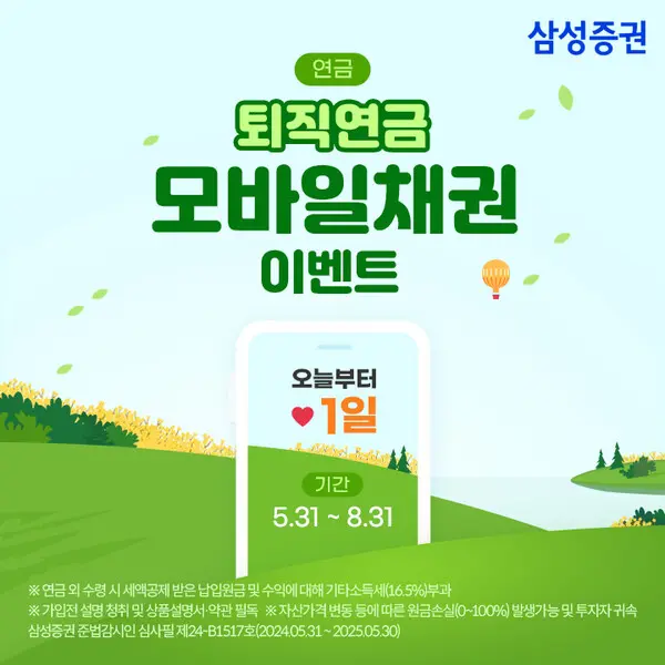 |스마트투데이=김세형 기자| 삼성증권은 삼성증권 DC/IRP 고객 대상으로 '퇴직연금 모바일채권' 이벤트를 8월말까지 진행한다고 11일 밝혔다.