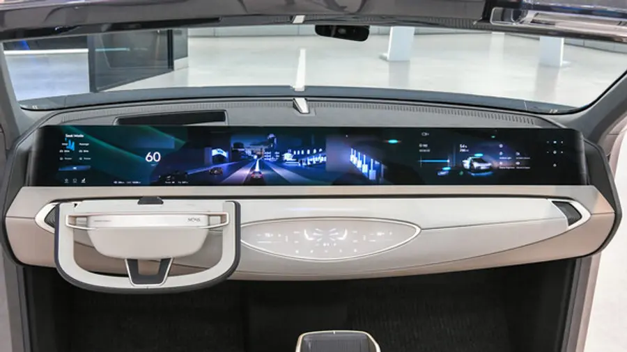 우선 디자인 측면에서는 운전석 왼쪽 필러(기둥)에서 동승석 오른쪽 필러까지 넓은 전면부 전체를 경계가 없는 하나의 대화면 칵핏으로 통합 구현했다. 여기에 디스플레이 패널의 크기와 기울기가 주행모드에 따라 조절되는 기술을 융합했다.