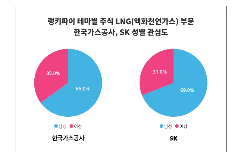 성별 관심도 분석에서 한국가스공사는 '남성'에게 '65%'의 관심을 받고 있으며, 한국가스공사는 여성보다 '남성'에게 높은 관심을 받고 있는 것으로 나타났다.이어 SK는 '남성'에서 '69%'의 높은 관심도가 나타났으며, 여성보다 '남성'에게 더 많은 관심을 받고 있음이 드러났다.