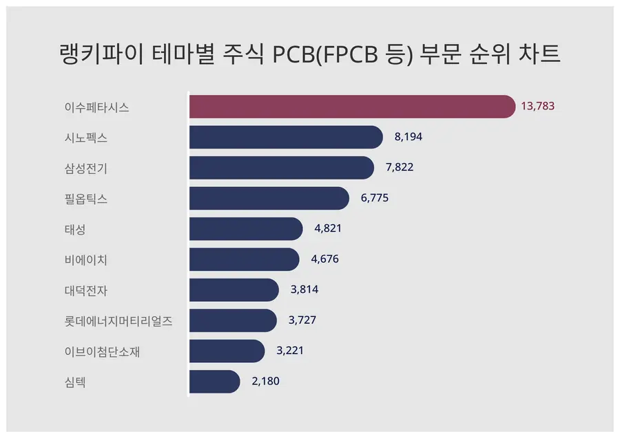 13,783포인트를 받은 이수페타시스가 테마별 주식 PCB(FPCB 등) 부문 트렌드지수 1위에 올랐다. 이어 2위는 8,194포인트가 나온 시노펙스이다.