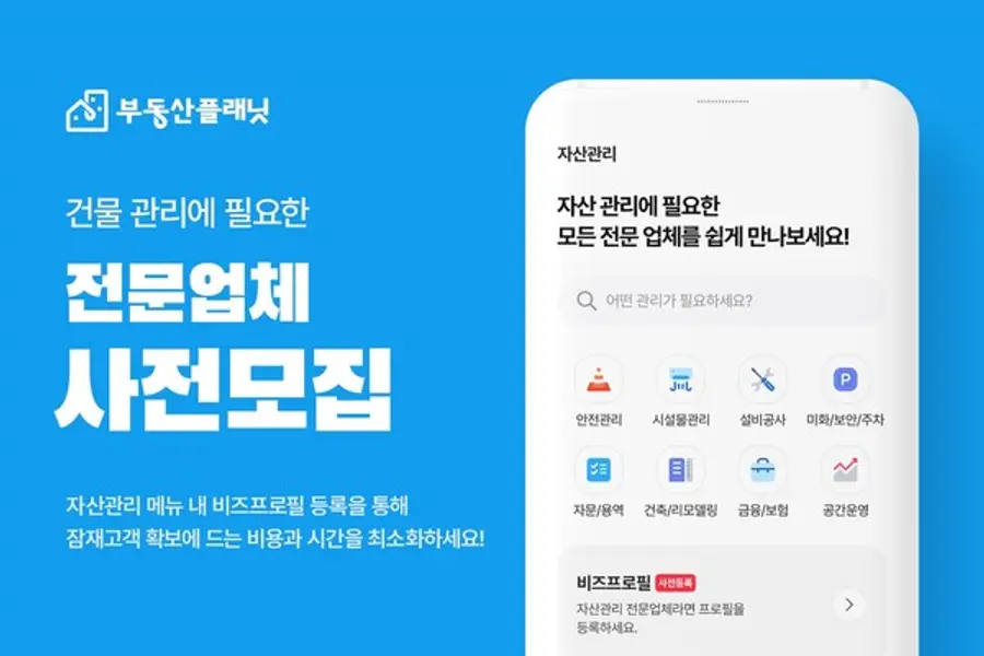 신청은 부동산플래닛 공식 홈페이지와 모바일 애플리케이션(앱) 내 '자산관리'에서 비즈프로필을 등록하면 된다. 분야별로 자격 요건 등 전문성 검증 절차를 거쳐 최종 선정되며 등록 업체들은 비즈프로필을 통해 건물주와 연결되는 기회를 얻을 수 있다.