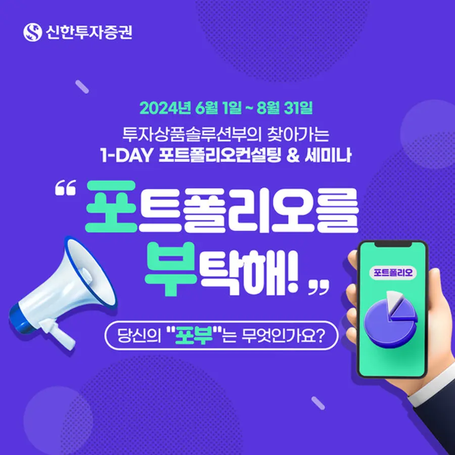 |스마트투데이=김윤진 기자| 신한투자증권은 투자자들의 고민을 해결해 주기 위한 ‘포트폴리오를 부탁해!’ 프로그램을 오는 8월 31일까지 실시한다고 13일 밝혔다.