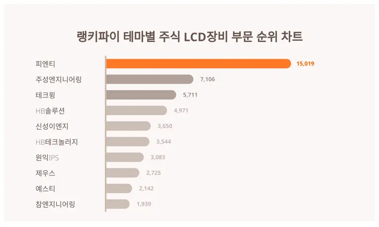 테마별 주식 LCD장비 부문 1위 자리는 피엔티가 가져갔다. 피엔티는 15,019포인트로 2위 주성엔지니어링(을)를 제쳤다.