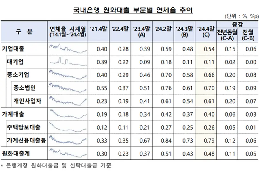 4월 중소기업대출 연체율은 전월 대비 0.08%p 뛴 0.66%를, 가계대출 연체율은 0.03%p 오른 0.40%를 각각 기록했다. 4월 대기업대출 연체율은 0.11%로, 3월과 같았다.