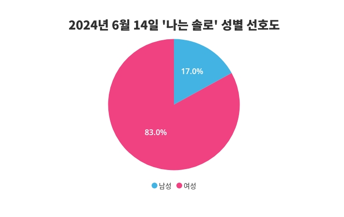 나는 솔로의 성별 관심도에서 여성가 83% 비율로 나는 솔로에 대한 관심도가 상대적으로 높은 것으로 나타났다.