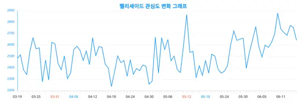 펠리세이드에 관한 트렌드지수 그래프가 최근 업데이트 되었으며, 현재 2,643 포인트를 기록, 전일 2,754 포인트 대비 하락하였다.