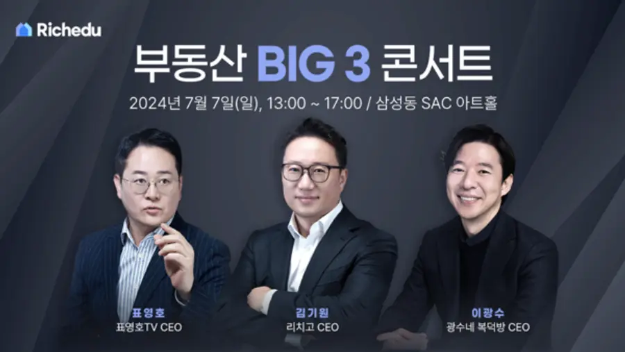 부동산 교육 전문 플랫폼 ‘리치에듀’는 다음달 7일 서울 삼성동 SAC아트홀에서 ‘부동산 BIG 3 콘서트’를 개최한다고 17일 밝혔다.