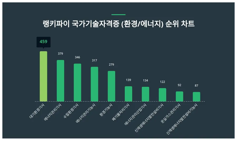 랭키파이 분석 결과 국가기술자격증 (환경/에너지) 트렌드지수 순위 1위는 459포인트를 받은 대기환경기사, 2위는 379포인트인 에너지관리기사, 3위는 346포인트의 수질환경기사(이)다.