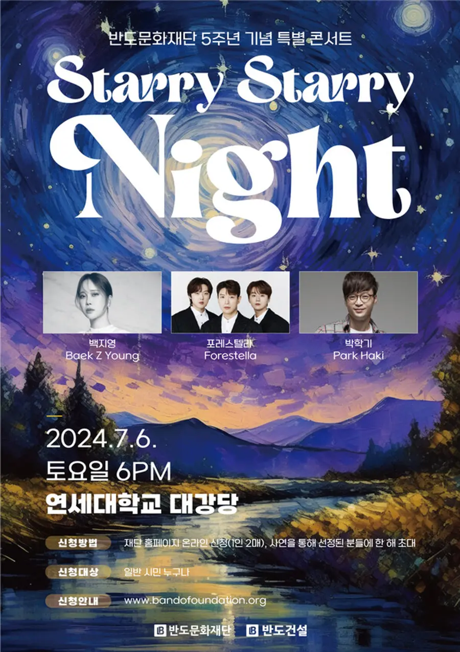 |스마트투데이=이재수 기자| 반도문화재단(이사장 권홍사)은 설립 5주년을 맞아 오는 7월 6일 오후 6시에 연세대학교 대강당에서 특별 콘서트 ‘Starry Starry Night’를 개최한다고 18일 밝혔다.