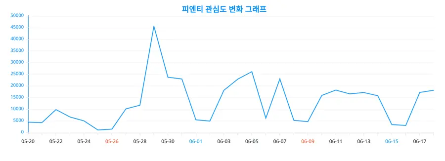 피엔티에 관한 트렌드지수는 현재 18,188 포인트를 기록, 전일 17,252 포인트 대비 상승하였다.