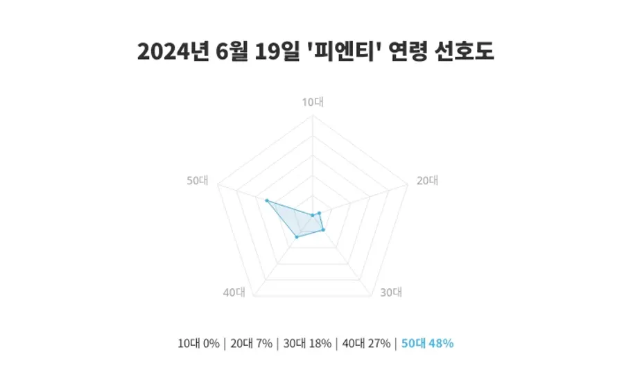 연령별 선호도 조사에서 50대의 관심도가 48%로 나타나, 특히 50대에게서 높은 인기를 확인할 수 있었다. 이는 전일 10대 0%, 20대 7%, 30대 17%, 40대 27%, 50대 48%와 비교하여 연령별 관심의 변화를 설명해 준다.