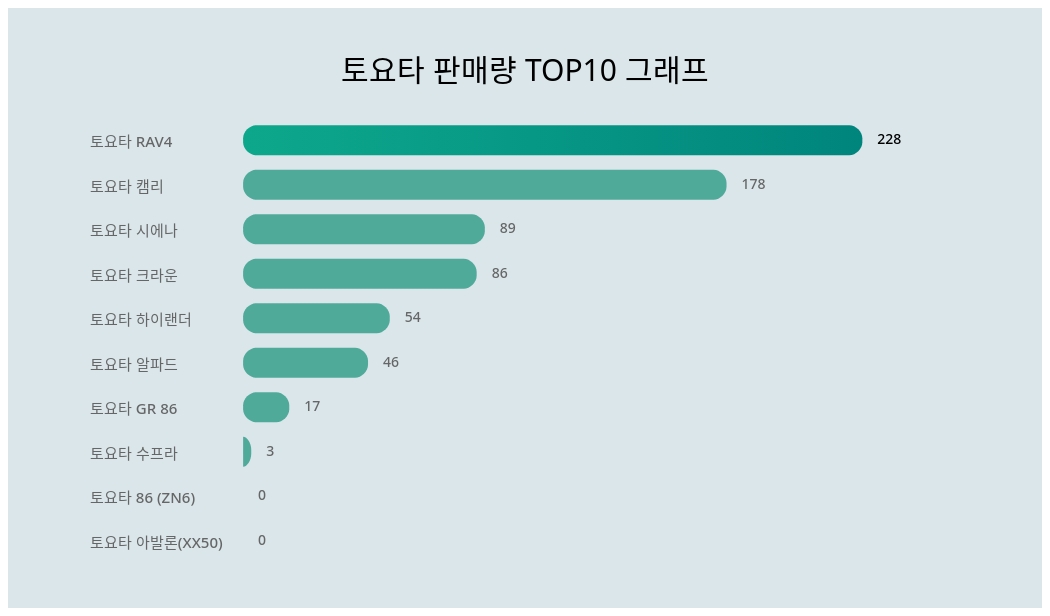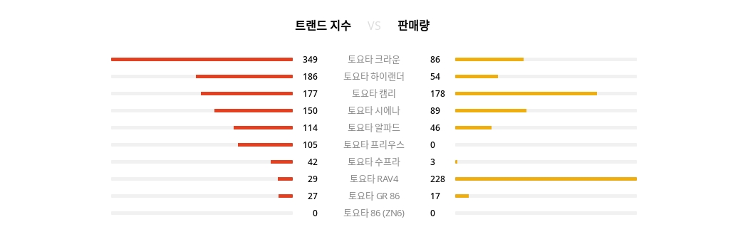추가적으로 트렌드지수 3위 토요타 캠리는 178대, 4위 토요타 시에나는 89대, 5위 토요타 알파드는 46대, 6위 토요타 프리우스는 0대, 7위 토요타 수프라는 3대, 8위 토요타 RAV4는 228대, 9위 토요타 GR 86은 17대, 10위 토요타 86 (ZN6)은 0대를 기록했다.