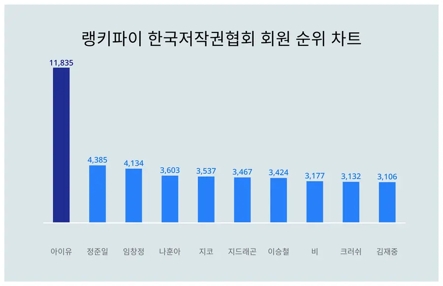 랭키파이에 따르면 6월 3주차 기준 한국저작권협회 회원 트렌드지수 1위는 아이유, 2위는 정준일이다.