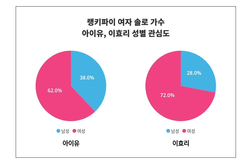 성별 관심도 조사 결과, 아이유는 '여성'에서 '62%'로 남성보다 높은 관심을 받는 것으로 나타났다.