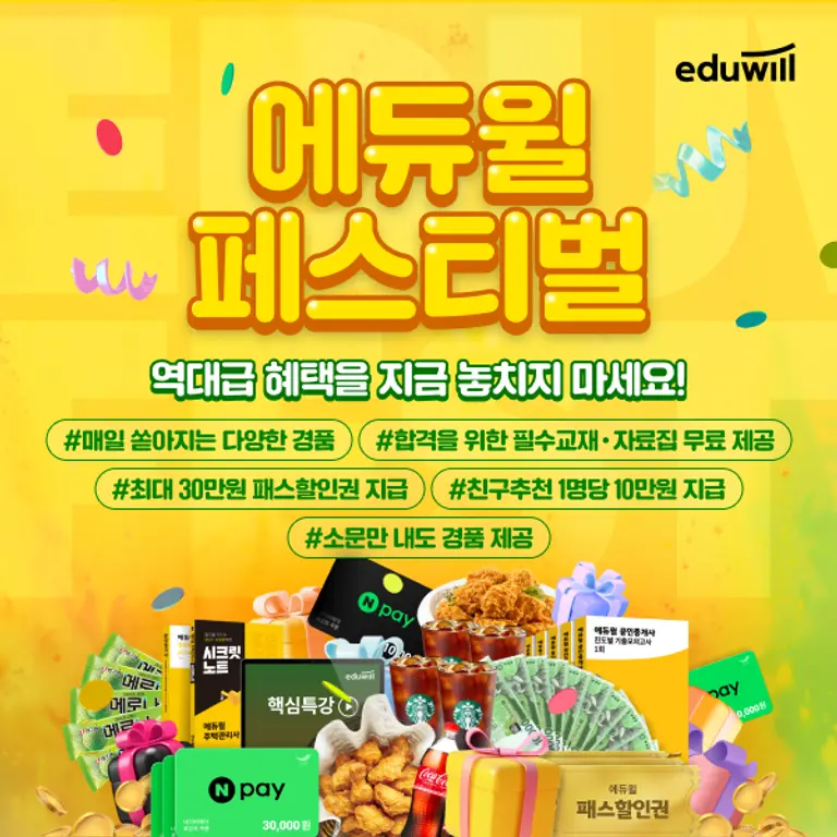 마지막으로 모든 회원이 참여할 수 있는 소문내기 이벤트도 준비했다. 각종 커뮤니티에 에듀윌 페스티벌 이벤트 페이지 URL과 해시태그를 넣어 게시글을 작성하면 된다. 50명을 추첨해 네이버페이 1만원권을 지급하고, 최다 참가자 3명에게는 네이버페이 5만원권을 선물한다.