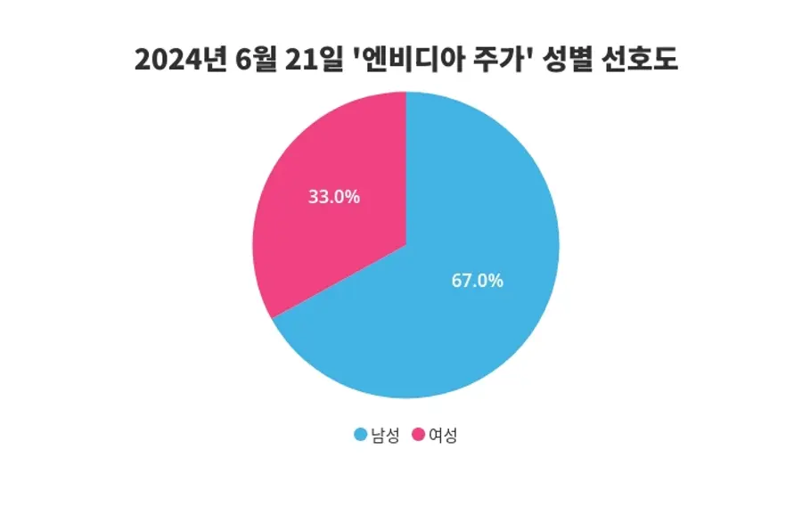 엔비디아 주가에 대한 성별 관심도에서 남성이 67% 비율로 높게 나타나 남성에서 엔비디아 주가에 대한 관심이 더 많은 것으로 나타났으며, 이는 전일 남성 68%, 여성 32%과의 비교를 통해 성별 관심도의 변화를 알아 볼 수 있다.