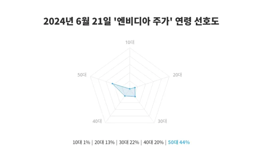 엔비디아 주가의 최근 연령별 선호도는 전일의 10대 1%, 20대 12%, 30대 22%, 40대 19%, 50대 46% 결과와 비교해 금일 10대 1%, 20대 13%, 30대 22%, 40대 20%, 50대 44%의 결과로 나타나, 연령층별 변화를 확인할 수 있다.