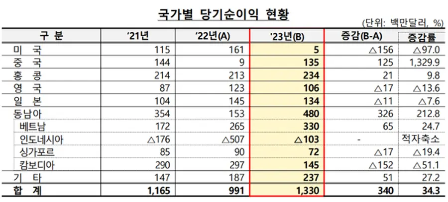 금감원은 26일 국내은행의 2023년 해외점포 경영현황 보고서를 발표했다. 지난 2023년 국내은행 해외점포의 당기순이익은 전년 대비 34.3% 증가한 13억3천만달러를 기록했다.