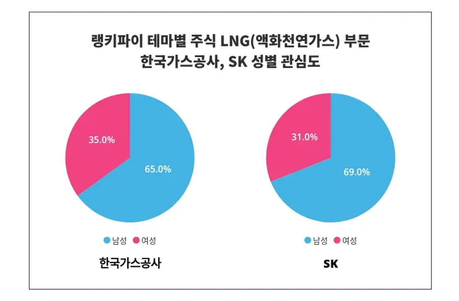 성별 관심도 분석에서 한국가스공사는 '남성'에게 '65%'의 관심을 받고 있으며, 한국가스공사는 여성보다 '남성'에게 높은 관심을 받고 있는 것으로 나타났다.이어 SK는 '남성'에서 '69%'의 높은 관심도가 나타났으며, 여성보다 '남성'에게 더 많은 관심을 받고 있음이 드러났다.