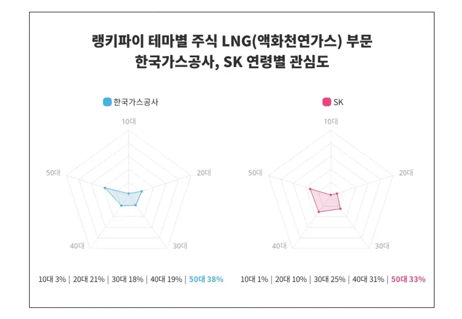 연령별 관심도 조사에 따르면, 한국가스공사와 SK 사이의 관심도는 각 연령대에서 다양하게 분포되어 있음이 확인되었다. 특히, 한국가스공사는 50대에서 38%의 관심도를 보여 가장 관심도가 높은 것으로 나타났다. 더불어 한국가스공사의 관심도는 10대 3%, 20대 21%, 30대 18%, 40대 19%, 50대 38% 순으로 나타났다.