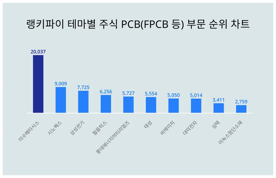 20,037포인트를 받은 이수페타시스가 테마별 주식 PCB(FPCB 등) 부문 트렌드지수 1위에 올랐다. 이어 2위는 9,009포인트가 나온 시노펙스이다.