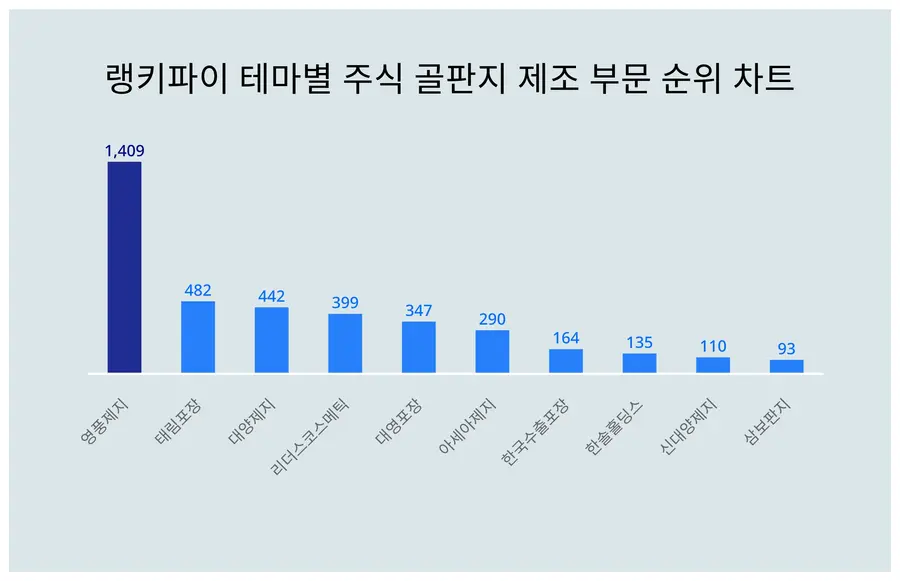 랭키파이 분석 결과, 테마별 주식 골판지 제조 부문 트렌드지수 순위 1위는 1,409포인트를 받은 영풍제지, 2위는 482포인트인 태림포장, 3위는 442포인트의 대양제지(이)다.