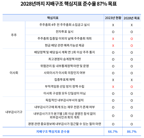 지배구조 선진화 관련해서는 오는 2028년까지 지배구조 핵심지표 준수율 87% 달성을 목표로 제시했다.