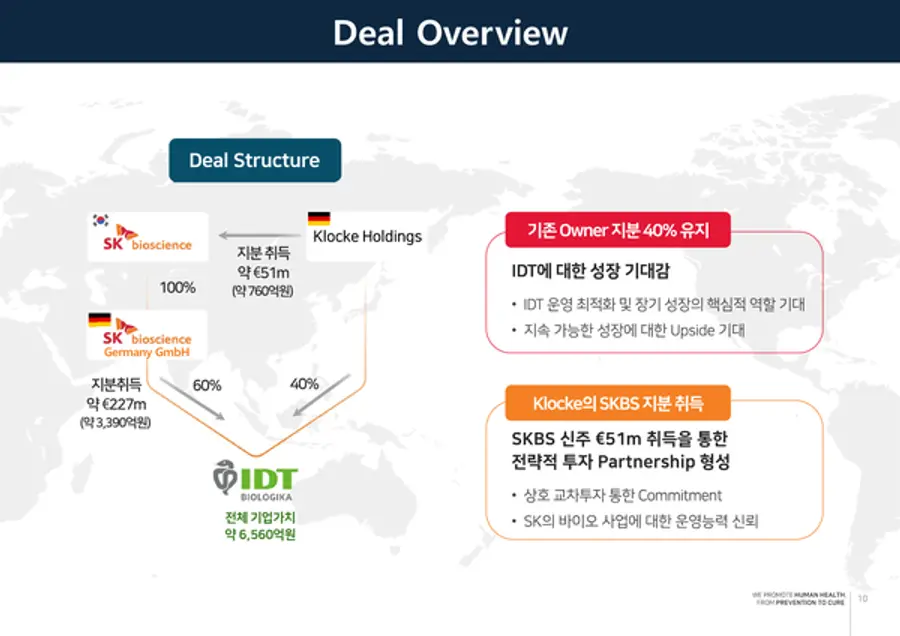 SK바이오사이언스는 IDT 구주와 신주를 인수한다. 구주로는 현재 대주주인 독일 투자회사 클로케 홀딩(Klocke Holding GmbH)으로부터 인수한다. 클로케는 IDT에 대해 지분 40%를 유지하는 한편, SK바이오사이언스에 약 757억원(1.9%)을 출자해, 전략적 투자 파트너십을 형성키로 했다.