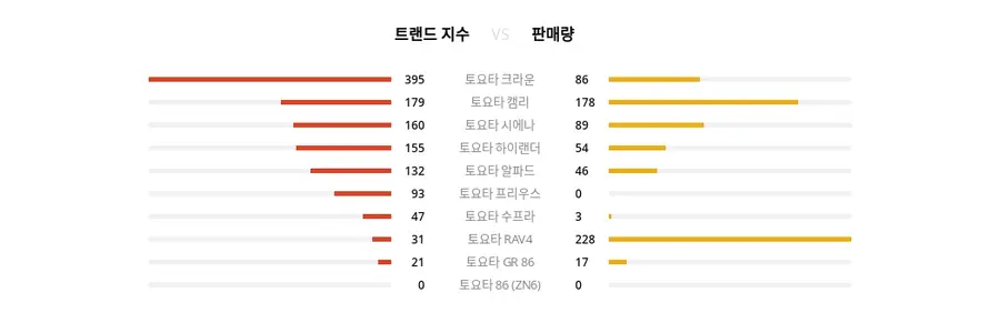 추가적으로 트렌드지수 3위 토요타 시에나는 89대, 4위 토요타 하이랜더는 54대, 5위 토요타 알파드는 46대, 6위 토요타 프리우스는 0대, 7위 토요타 수프라는 3대, 8위 토요타 RAV4는 228대, 9위 토요타 GR 86은 17대, 10위 토요타 86 (ZN6)은 0대를 기록했다.