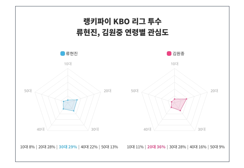연령별 관심도 조사에서 류현진과 김원중의 관심도가 다양한 연령층 사이에서 어떻게 분포되어 있는지 명확히 드러났다. 조사 결과, 류현진은 특히 30대에서 29%의 높은 관심도를 기록하며 가장 큰 관심을 끌고 있는 것으로 나타났다. 류현진의 인기는 10대 8%, 20대 28%, 30대 29%, 40대 22%, 50대 13%순으로 이어지며, 각 연령대별에서 어떠한 관심을 받고 있는지가 조사되었다.