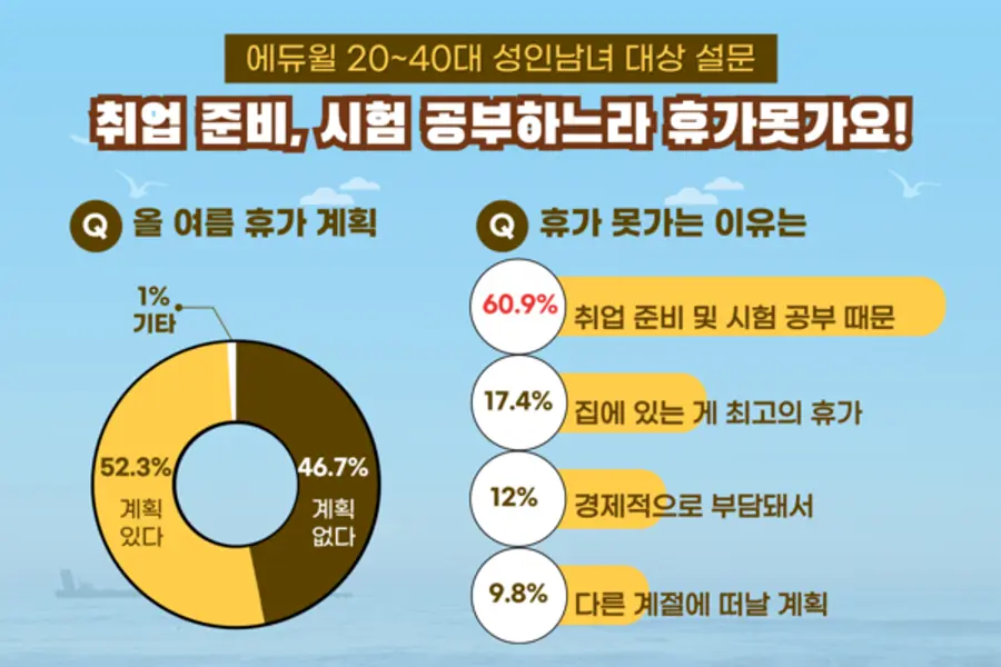에듀윌의 설문에 따르면, 전체 응답자의 52.3%는 올해 여름 휴가 계획이 있다고 답했다. 휴가 계획이 없다고 응답한 비율도 46.7%로 비슷하게 나타났다.