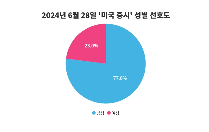 미국 증시에 대한 성별 관심도에서 남성이 77% 비율로 나타나 남성에서 미국 증시에 대한 관심이 더 많은 것으로 나타났으며, 이는 전일 남성 77%, 여성 23%과의 비교를 통해 성별 관심도의 변화를 알아 볼 수 있다.