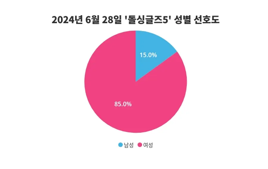 돌싱글즈5의 최신 성별 관심도 조사 결과, 전일 남성 15%, 여성 85%의 결과가 나왔고, 금일에는 여성이 85%의 비율로 돌싱글즈5에 더 높은 관심을 갖는 것으로 나타났다.