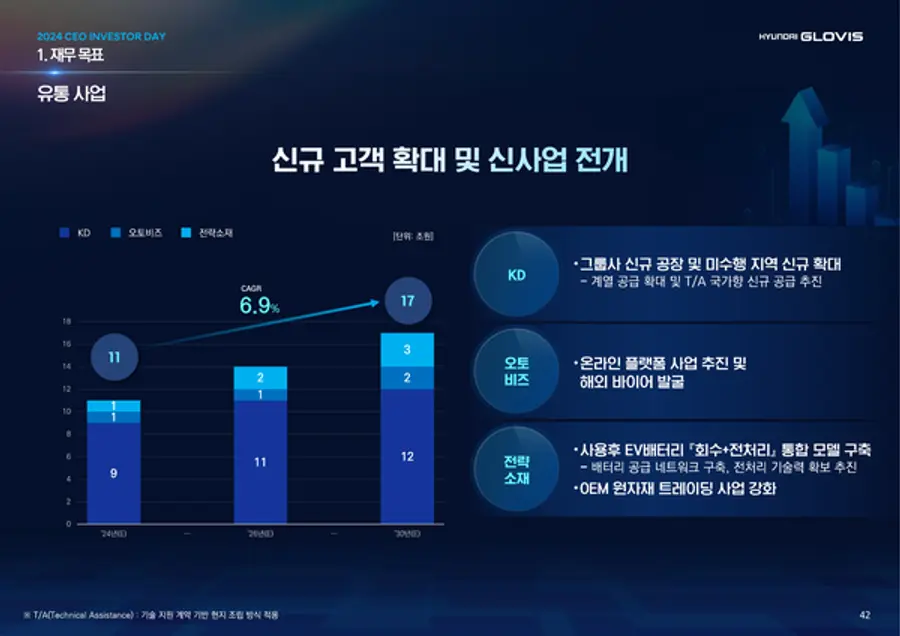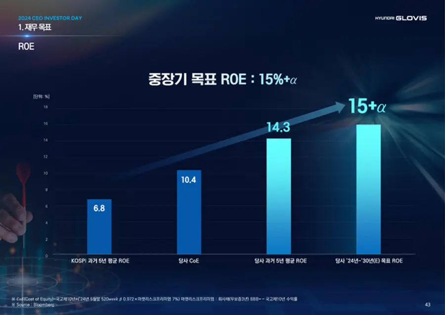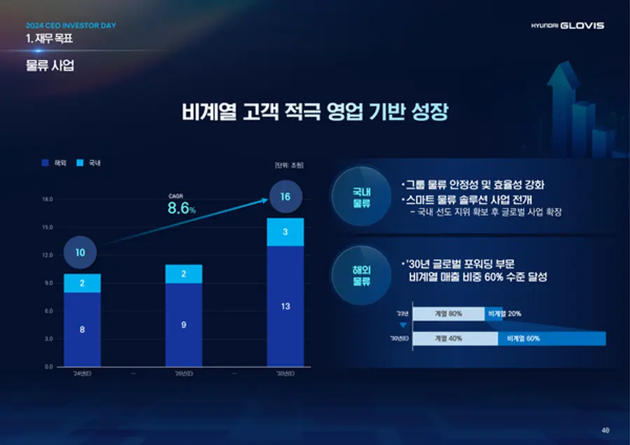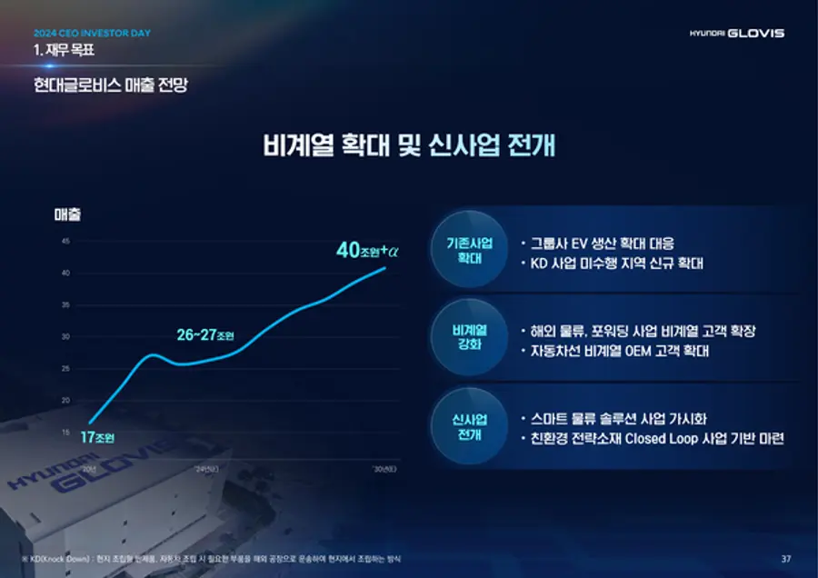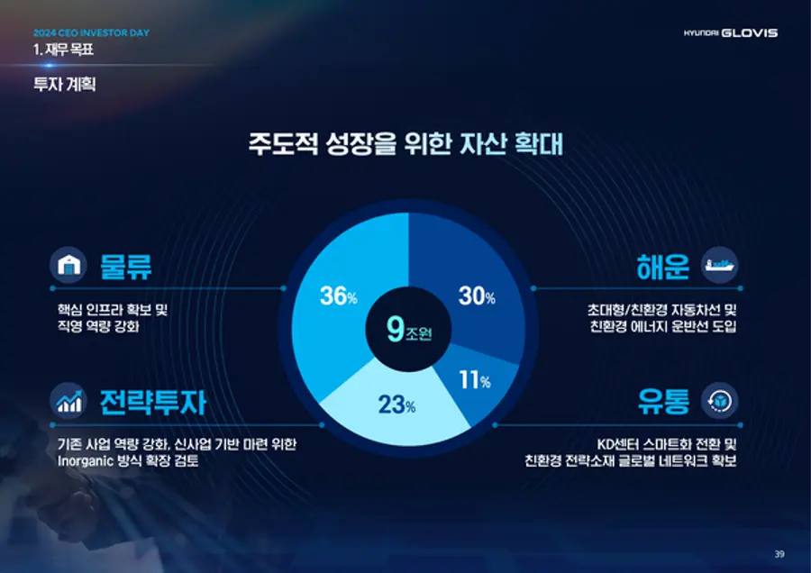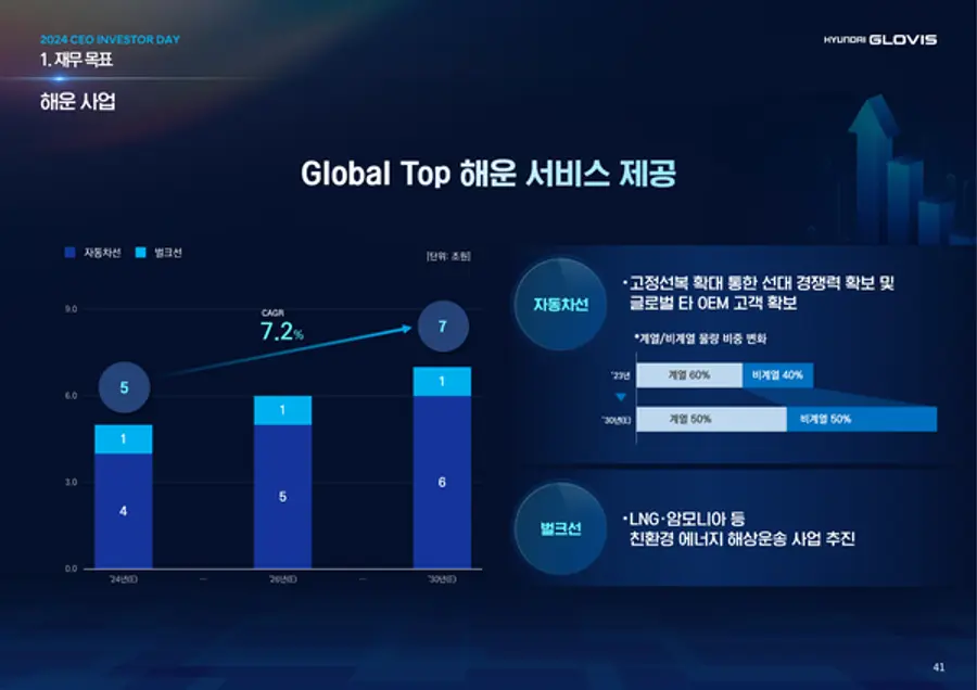 |스마트투데이=김세형 기자| 현대글로비스가 오는 2030년 매출은 40조원 이상, 영업이익률은 7% 수준 달성하겠다는 중장기 재무목표를 제시했다.