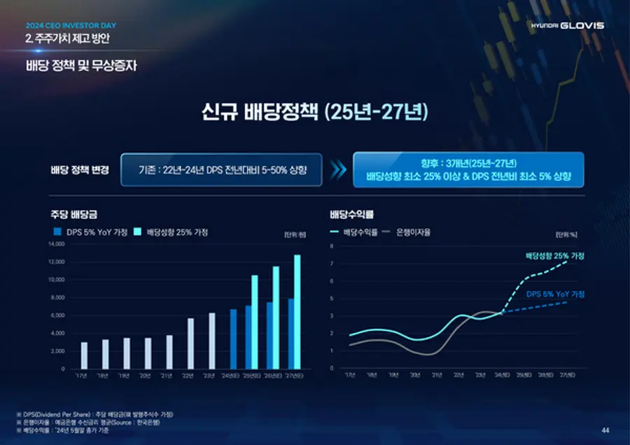 특히 배당성향으로 연결 기준 배당성향을 최소 25% 이상을 설정했다. 현대글로비스의 최근 3년간 배당성향은 20% 수준으로 5%포인트 끌어올리겠다는 방침이다.
