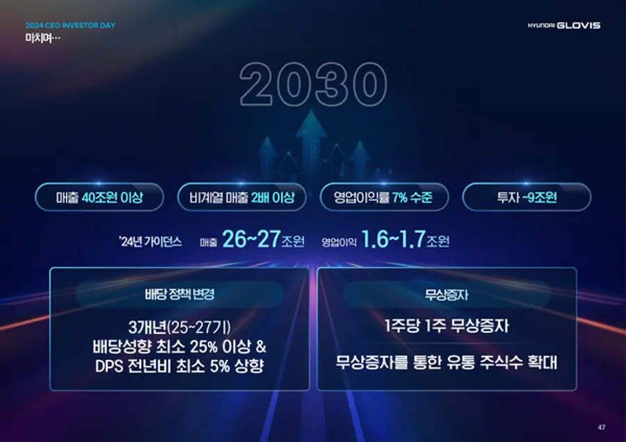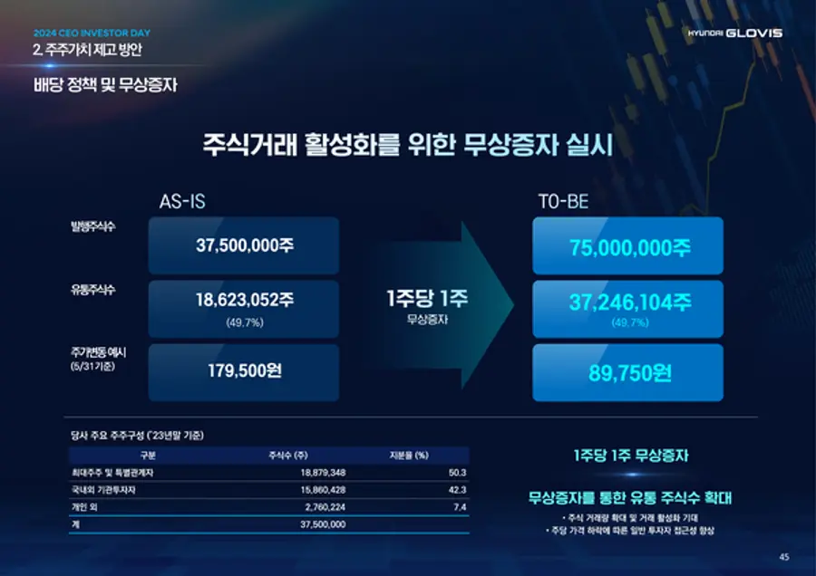 현대글로비스는 이와 함께 100% 무상증자와 배당성향 상향 방침을 밝혔다.