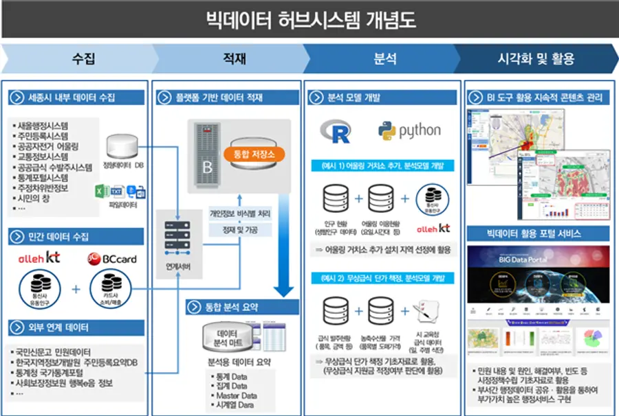시는 세종형 빅데이터 허브에 수집된 데이터를 부서 간 공동 활용하도록 하고 이를 근거로 시민생활과 밀접한 정책을 수립, 시민 만족도 및 부가가치가 높은 행정서비스를 제공한다는 계획이다.