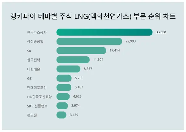 테마별 주식 LNG(액화천연가스) 부문 트렌드지수에서 한국가스공사 주가는 랭키파이 2024년 7월 1주차 트렌드지수 분석 결과 1위를 차지했다.