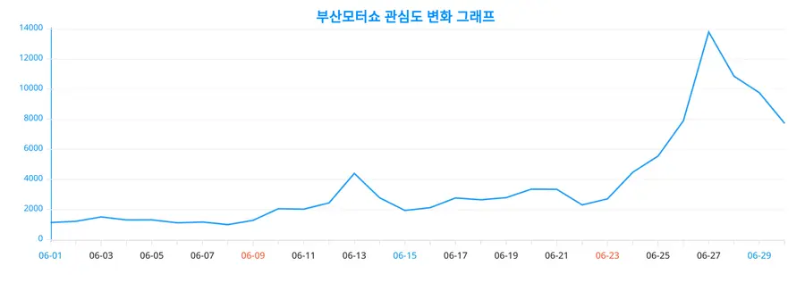부산모터쇼에 관한 트렌드지수는 현재 7,732 포인트를 기록, 전일 9,770 포인트 대비 하락하였다.