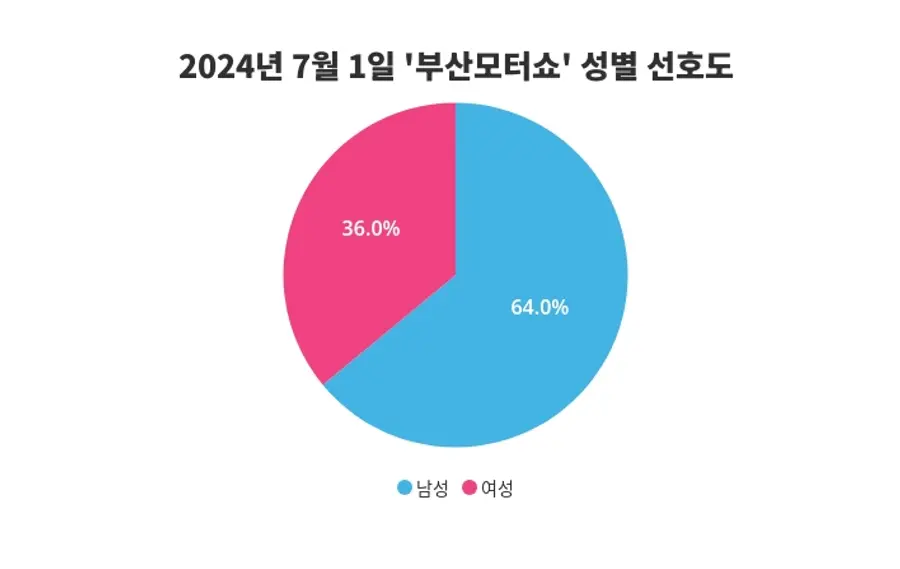 부산모터쇼에 대한 성별 관심도 조사에서 남성의 관심이 64%로 집계되어, 성별 관심도에서는 남성이 부산모터쇼에 대한 관심도가 높은 것으로 나타났다. 성별에서는 전일의 남성 64%, 여성 36% 대비 성별 선호 차이를 확인 할 수 있다.