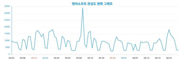 이번에 공개된 엔씨소프트 관련 90일간 트렌드 변화 그래프는 트렌드 변동을 데이터로 흥미롭게 보여주고 있다.