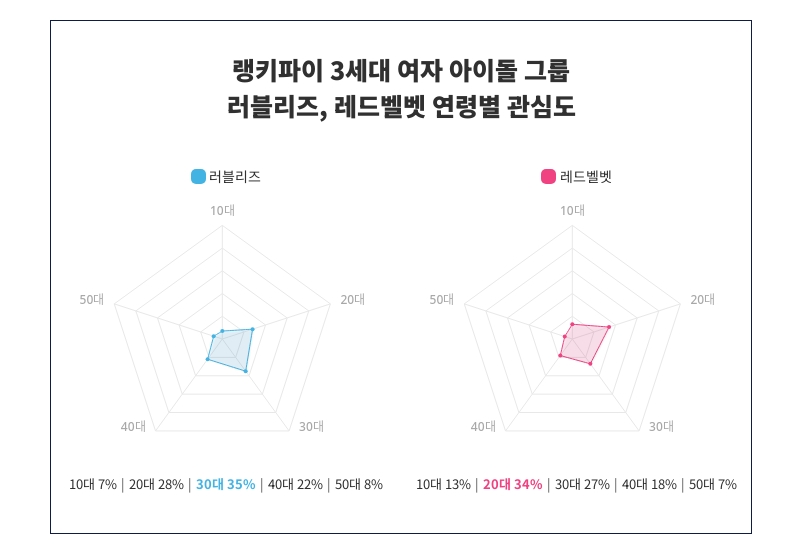 연령별 관심도 조사에 따르면, 러블리즈와 레드벨벳 사이의 관심도는 각 연령대에서 다양하게 분포되어 있음이 확인되었다. 특히, 러블리즈는 30대에서 35%로 가장 관심도가 높은 것으로 나타났다. 더불어 러블리즈의 관심도는 10대 7%, 20대 28%, 30대 35%, 40대 22%, 50대 8% 순으로 나타났다.