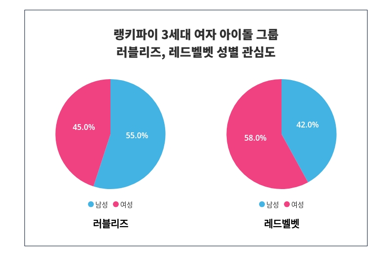 이어 레드벨벳은 '여성'에서 '58%'의 높은 관심도가 나타났으며, 남성보다 '여성'에게 더 많은 관심을 받고 있음이 드러났다.