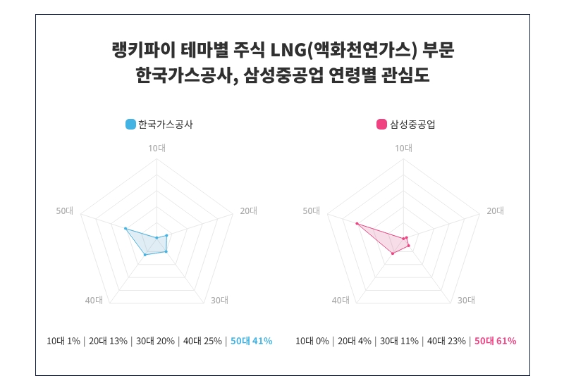 연령별 관심도 조사에 따르면, 한국가스공사와 삼성중공업 사이의 관심도는 각 연령대에서 다양하게 분포되어 있음이 확인되었다. 특히, 한국가스공사는 50대에서 41%의 관심도를 보여 가장 관심도가 높은 것으로 나타났다. 더불어 한국가스공사의 관심도는 10대 1%, 20대 13%, 30대 20%, 40대 25%, 50대 41% 순으로 나타났다.